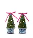 The 6" Bottle Brush Tree in Chinoiserie Urn Ornament features a festive mini tree adorned with colorful baubles and a bright pink velvet bow, nestled in a decorative ceramic-style urn. Each ornament is styled with a different blue and white Chinoiserie pattern at the base, blending classic elegance with playful holiday charm. Two distinct styles are available, each sold separately.