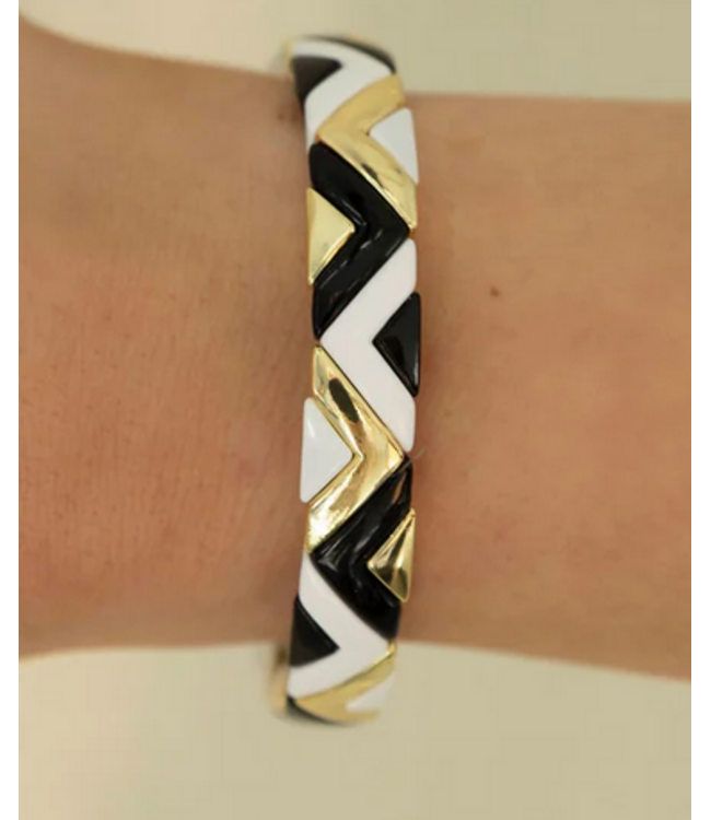 Add a bold pop of color to your stack with this eye-catching aztec enamel bracelet. Featuring glossy enamel links accented with high-shine 14k gold plating over brass, this stretchy bracelet slips on effortlessly for all-day comfort. The vibrant zig-zag design makes it perfect to wear solo or layered with your favorite Belle bracelets.
