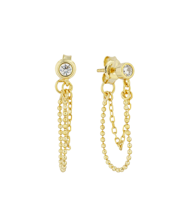 Sleek with a subtle edge. These contemporary studs feature bezel-set CZ stones paired with a dainty gold chain detail for a layered, connected look. Made with 14K gold vermeil over a 925 sterling silver base, they add just the right amount of sparkle and style