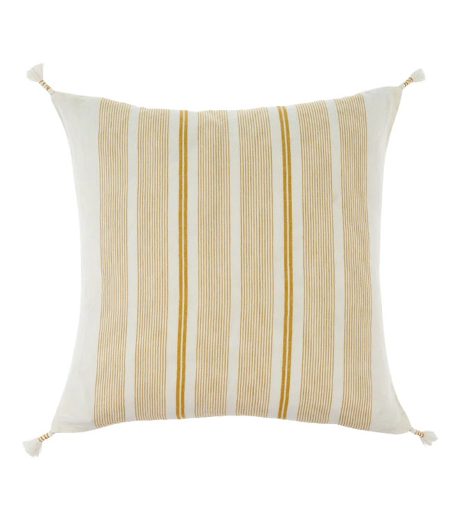 The woven ochre stripes of the Cape May Linen Pillow are woven and not printed for an extra fresh and crisp look. With classic pinstripes and hand wrapped tassels at each corner, this pillow styles well with coastal and monochromatic colour palettes for contemporary feeling layered sofas and beds.