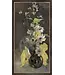 A vase of flowers in shimmering gold and green tones and soft blush against a smoky dark earth ground. The rough brush stokes are simple, luscious and confident. Framed in a thin dark wood moulding with a beaded detail.