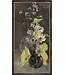 A vase of flowers in shimmering gold and green tones and soft blush against a smoky dark earth ground. The rough brush stokes are simple, luscious and confident. Framed in a thin dark wood moulding with a beaded detail.