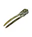 This 4-3/4" (2 Prong) hair pick with a decorative, antique handle design made from horn, has unique natural coloring so no two are exactly the same.