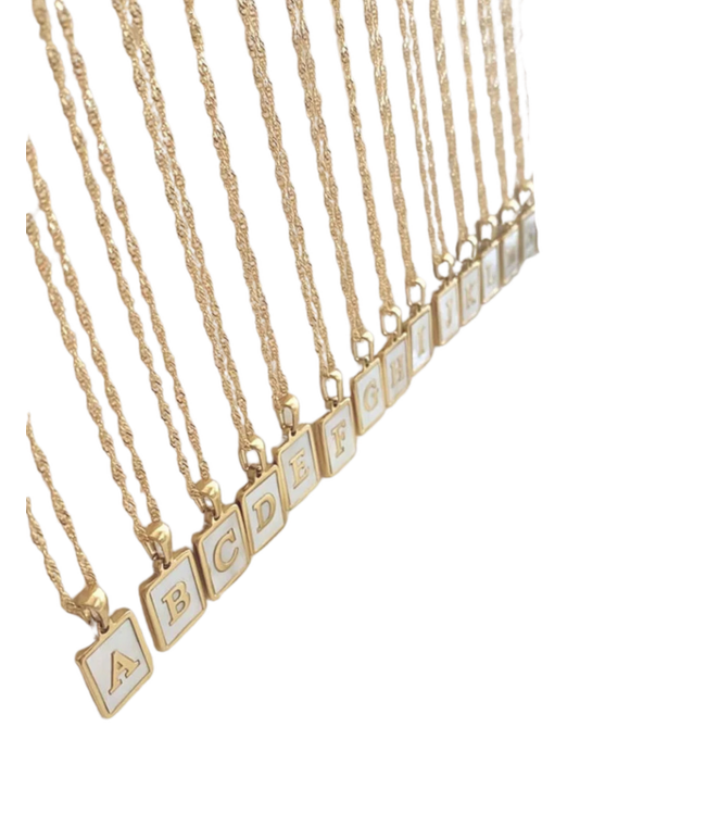 Measures 19” + 2” lead chain.Composed of lustre gold plated brass, mother of pearl inlay.Hypoallergenic, nickel and lead free.Designed and assembled in Canada.