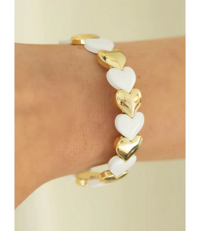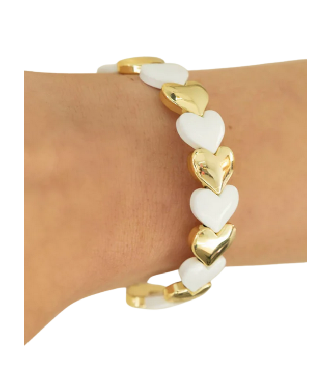 All the hearts, all the love. The Lots of Love Heart Bracelet is the ultimate girly statement, featuring alternating glossy pink enamel and 14k gold plated brass heart links for a super cute, luxe look. Designed on a comfortable stretch band, it slips on easily and layers perfectly with your favorite bracelets.