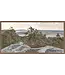 Colourful landscape featuring rock ground, trees, and a distant lake. Framed in a rustic wood moulding with a distressed grey finish.