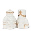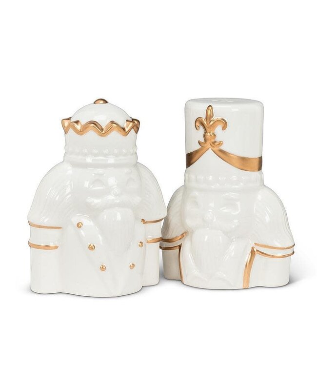 Complement your holiday table with this elegant pair of Nutcracker Salt & Pepper Shakers. Crafted out of ceramic, these elegant white shakers sculpted in the shape of regal Nutcracker characters, accented with golden trim, are sure to elevate any festive entertaining occasion – and spice up any meal!