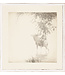 This delicate etching implies a morning fog that obscures the wading moose from view. Finished in a frame with a distressed white finish.