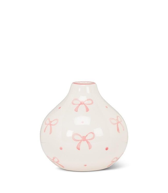 Round, refined, and ready to elevate your floral game. This ball-shaped ceramic vase adds subtle flair with its pink bow accents, creating a playful contrast against its clean ivory glaze. Small in size, big on personality.