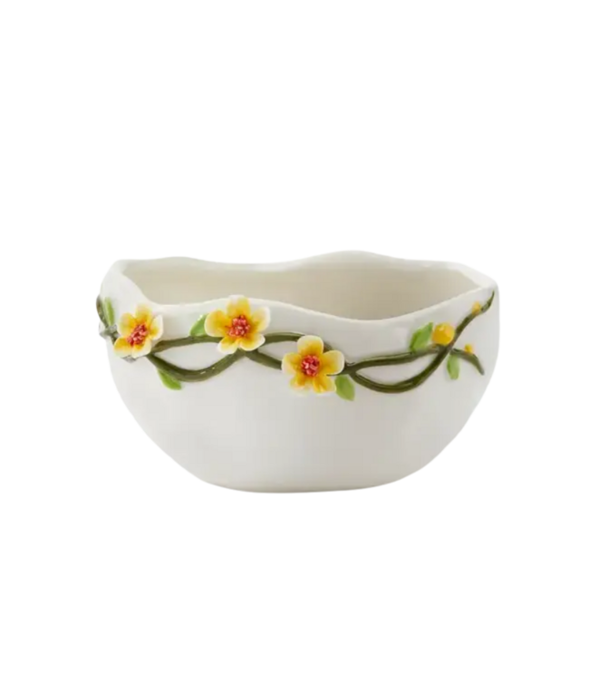 This Flower Bowl offers a delicate touch with its 3D yellow flower design. The white bowl with floral details makes a lovely accent for any table or shelf. FDA Approved. Handwash Only. Porcela